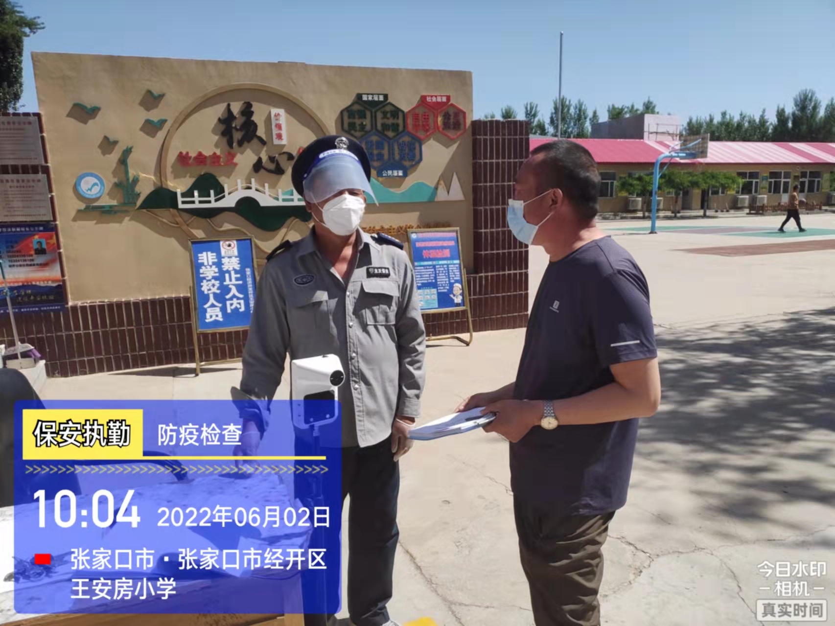 會后,我公司迅速召開“疫情期間學校門衛(wèi)安全防控工作要求”的會議,制定了校園安全防疫規(guī)定:疫情防控期間,校園保安隊員必須穿制服,規(guī)范佩戴“三件套”(防護隔離面罩、N95口罩、一次性PVC手套);進出校園的師生必須測量體溫,外來人員需登記、測溫、掃碼(幸福張家口,呈綠碼)、且持7日內(nèi)核酸陰性檢測結(jié)果;保安室需保持干凈整潔,物品擺放有序,勤開窗通風,定期噴灑消毒藥水。為此,公司特成立校園防疫檢查小組,由副經(jīng)理帶隊,協(xié)同主管大隊長對經(jīng)開區(qū)所有中小學校安保崗位進行防疫工作檢查,檢查期間,發(fā)現(xiàn)問題,現(xiàn)場處理,并及時與校方領(lǐng)導溝通,杜絕同樣問題再次出現(xiàn),確保校園防疫安保工作萬無一失,為各校師生鑄就一道安全防線!